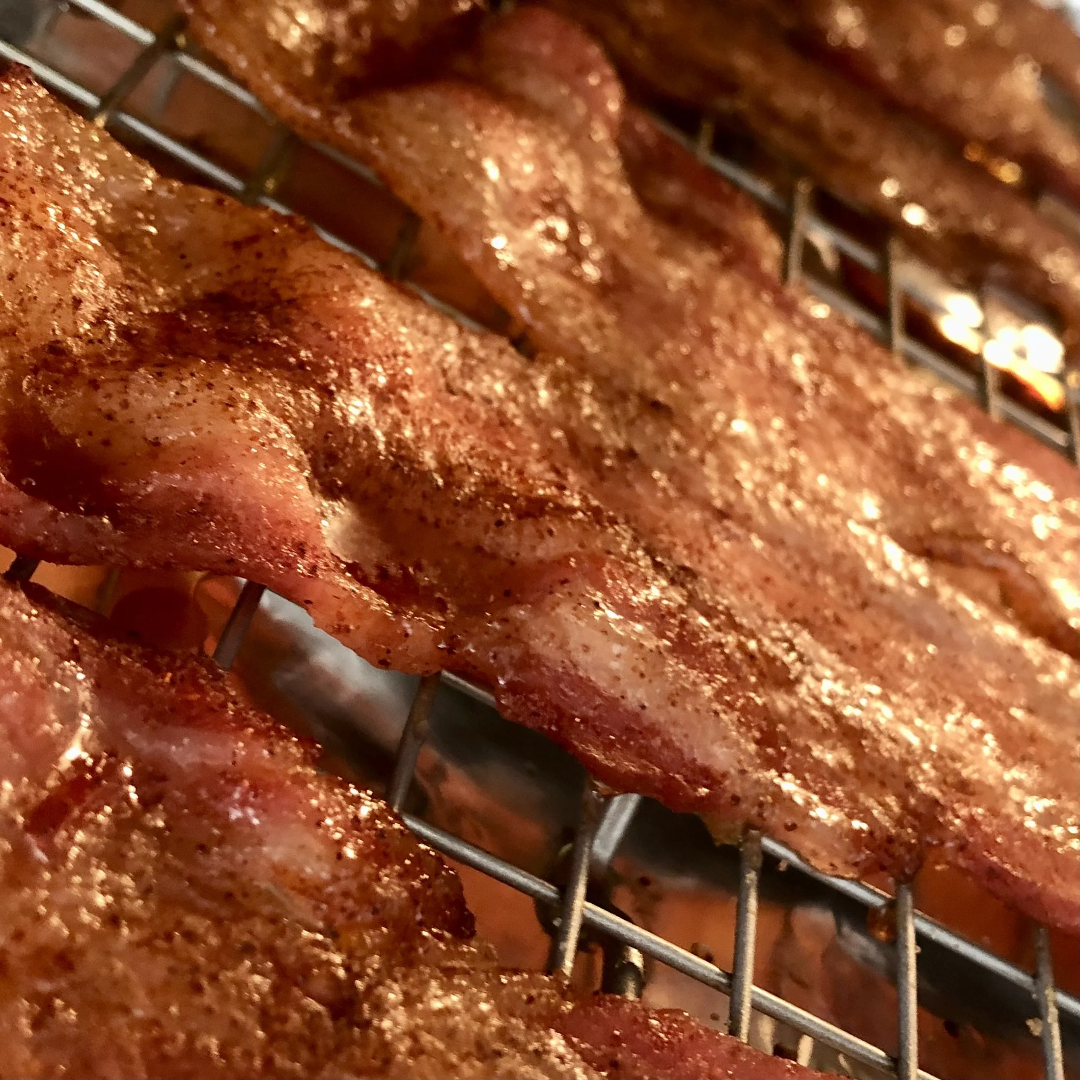 - Place Bacon in roasting rack on sheet tray in a single layer, I’d they are touching sides it’s ok, try to have no over lapping.